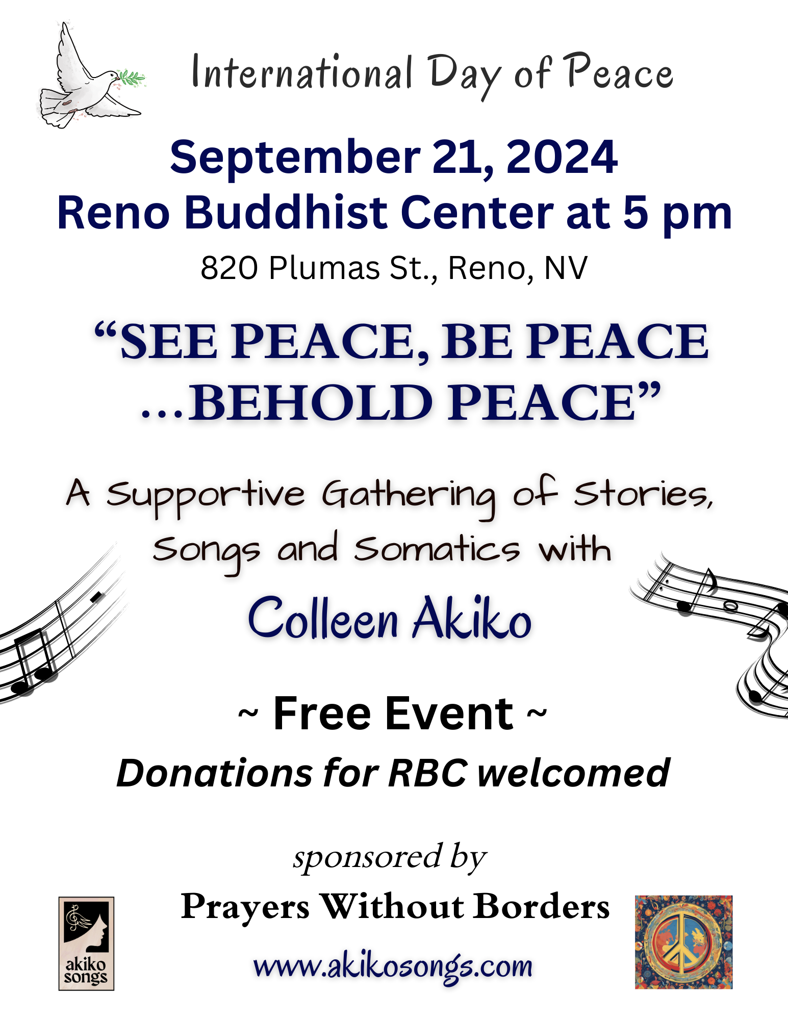 On the International Day of Peace at Reno Buddhist Center will be a concert celebrating peace.  Singer and musician, Colleen Akiko, will offer personal stories and songs welcoming peace into our hearts.  This event is sponsored by "Prayers without Borders".  Everyone is welcome to attend this special experience.